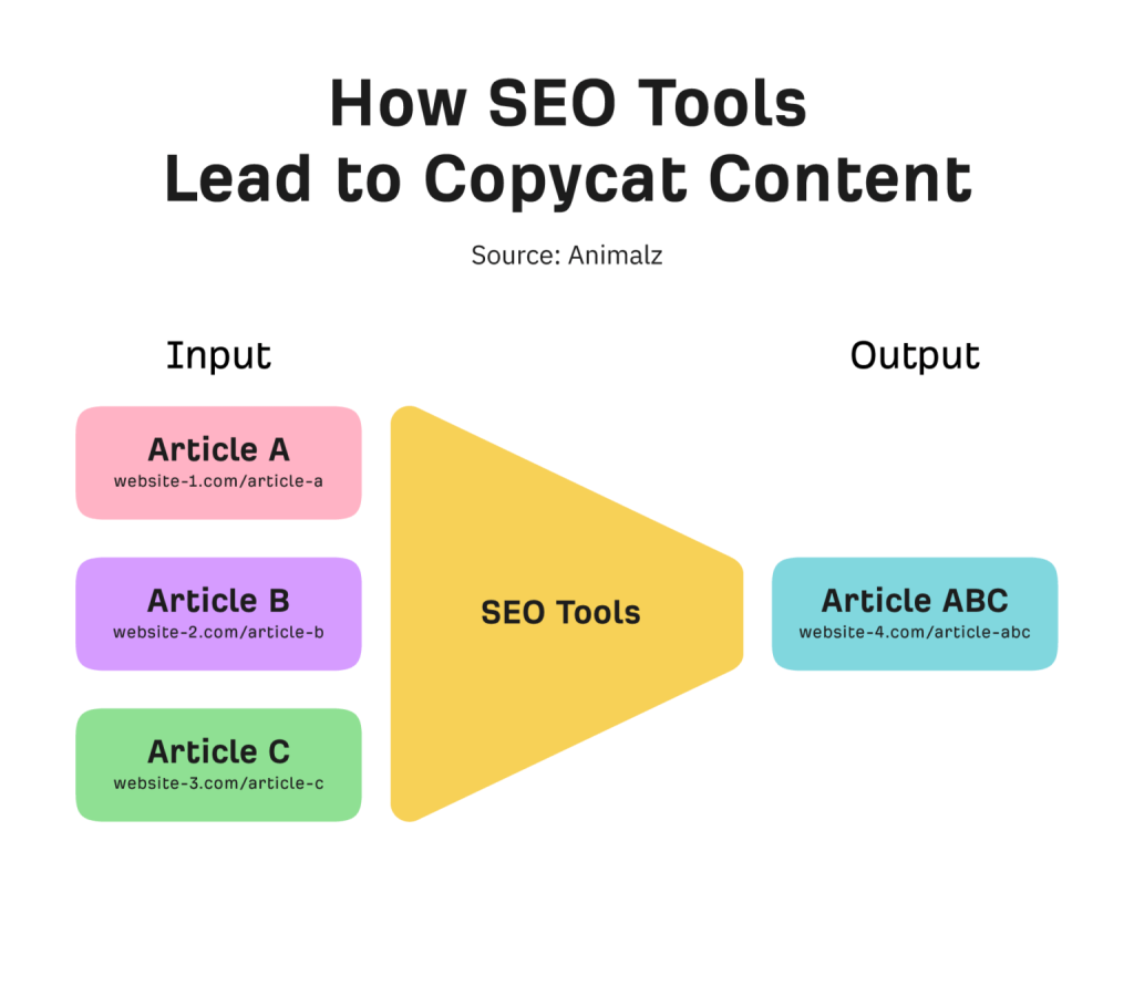 If you base the entirety of your content on top-ranking pages, you’ll end up with copycat content. This content fails to stand out from the crowd or offer anything unique.
