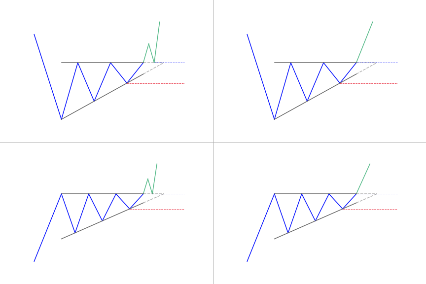 Due to its shape, the pattern has a (less popular) other name: a right-angle triangle. Two or more equal highs form a horizontal line at the top. Two or more rising troughs form an ascending trend line that converges as it rises on the horizontal line. If both of the lines extend towards the right, the ascending trend line could act as the hypotenuse of a right triangle.