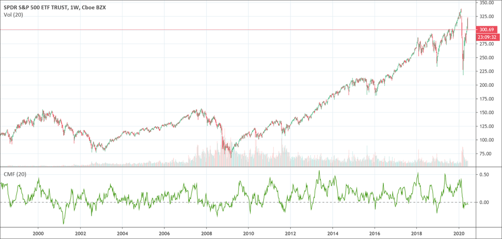 The standard CMF period is three weeks. The principle behind the CMF is that, the nearer the closing price is to the high, the more accumulation has occurred. On the other hand, the closer the end price is to the low, the more distribution has occurred.