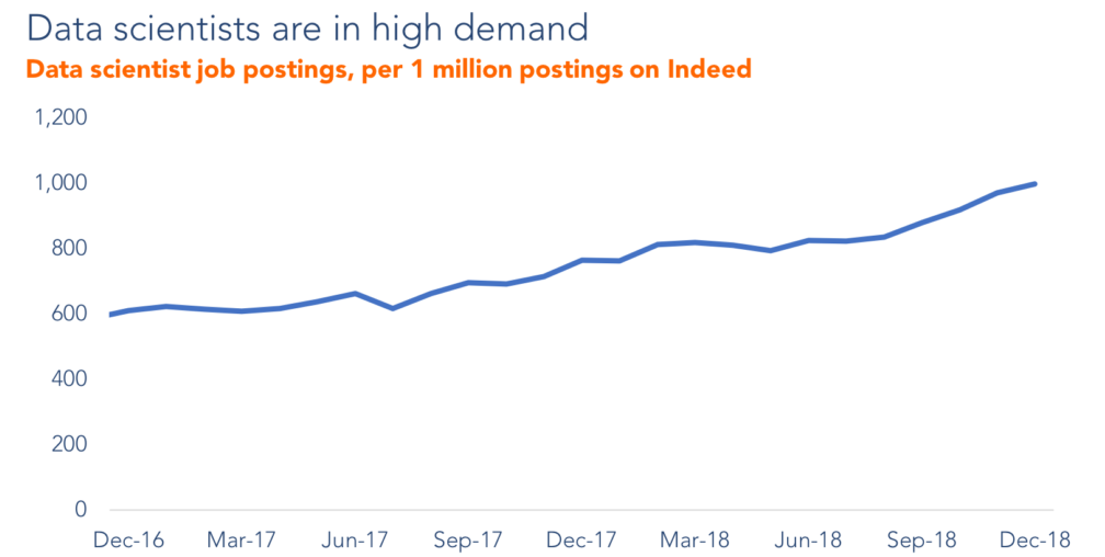 Following are the trends in Data Science job postings per 1 million postings on Indeed –