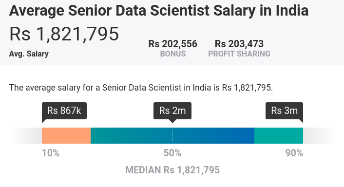 A Senior Data Scientist are the ones who have been engaged in data science for many years and are acquainted with the very depth of this field. A Senior Data Scientist in India earns on an average, a salary of Rs. 18,21,795.