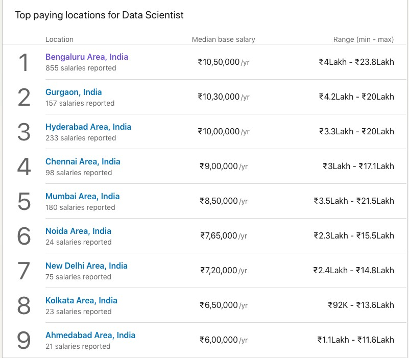 Major metropolitan cities like Bengaluru, Mumbai and Delhi have a high concentration of data science companies as well as thriving tech companies. Furthermore, various burgeoning startups in these cities are working on data science technologies.