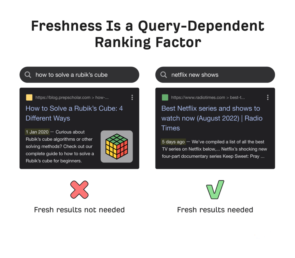 Freshness is a query-dependent ranking factor. It’s stronger for searches that call for fresh results. That’s why you see a recently published top result for “new netflix series” but not “how to solve a rubik’s cube.”
