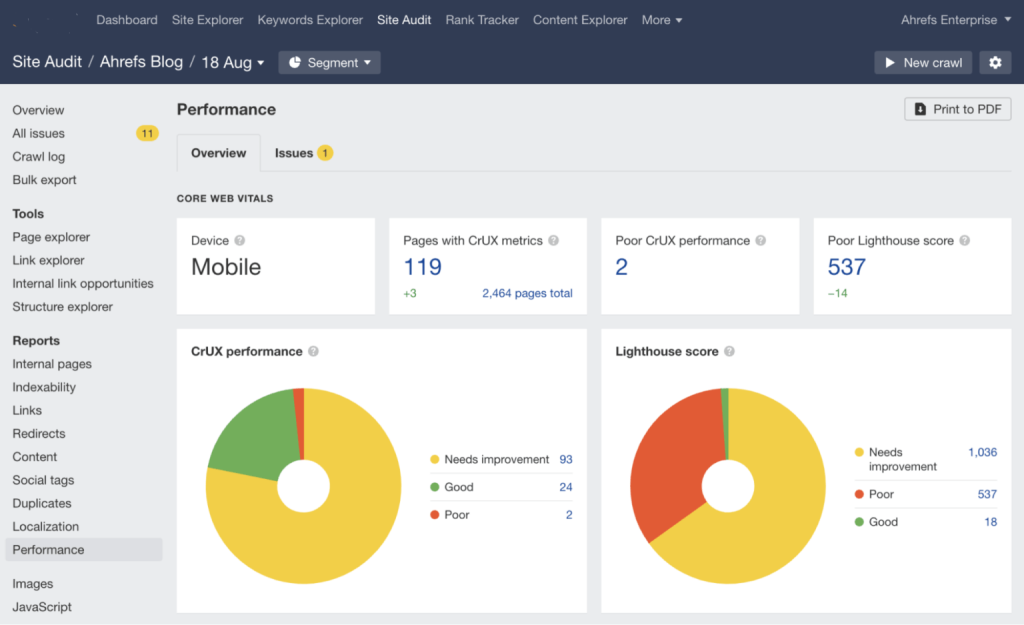 Sign up for a free Ahrefs Webmaster Tools account, crawl your website with Ahrefs’ Site Audit, then go to the Performance report. In general, the less red you see, the better.
