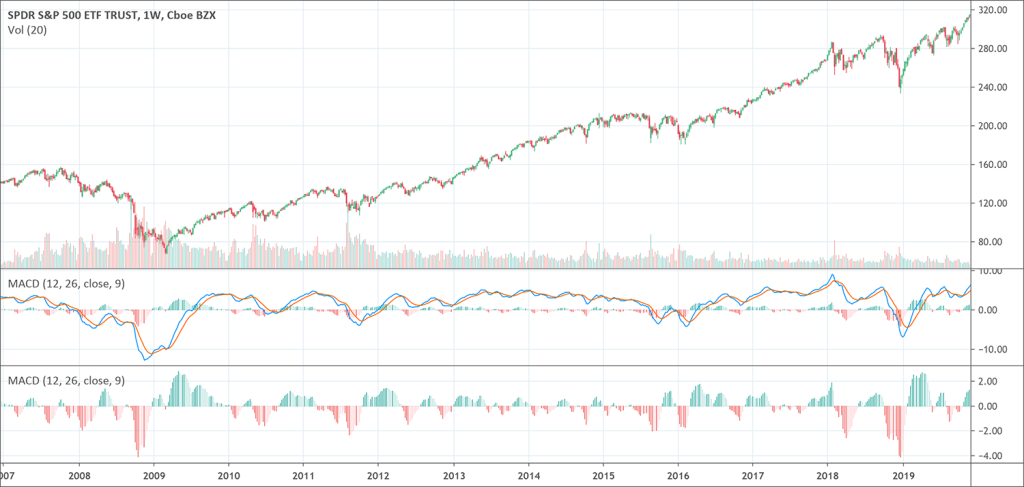 Gerald Appel created the Moving Average Convergence Divergence (MACD) indicator in the late 1970s. The indicator is one of the simplest and most efficient momentum indicators out there. The MACD turns two indicators, moving averages, into a momentum oscillator. It does so by subtracting the longer moving average from a short one. Due to this, the indicator gives the best of both worlds: momentum and trend following.