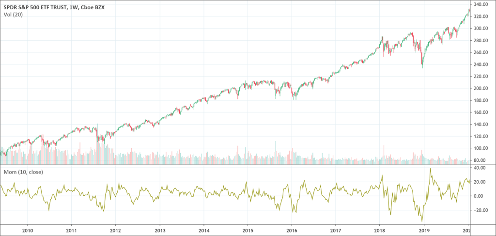 The momentum indicator does not provide a lot of information beyond what can be seen just by looking at the price chart itself. If the price is aggressively moving higher, it prints on the price chart and on the momentum indicator.