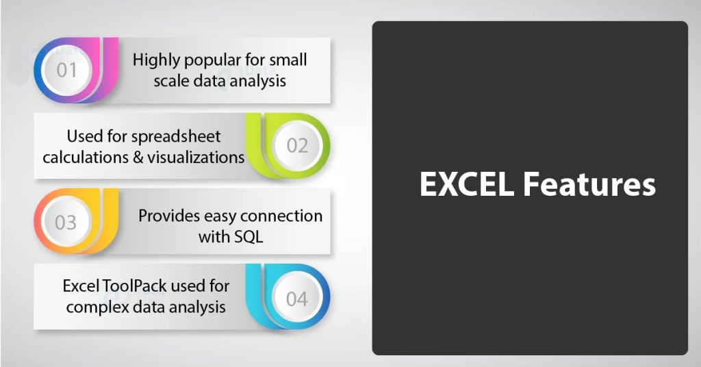 Excel comes with various formulae, tables, filters, slicers, etc. You can also create your own custom functions and formulae using Excel. While Excel is not for calculating the huge amount of Data, it is still an ideal choice for creating powerful data visualizations and spreadsheets.