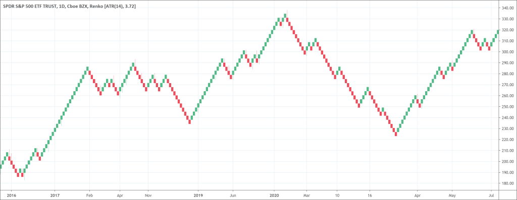 Renko charts have individual blocks of the same size because the chart doesn’t consider time. The Renko chart has a setting parameter, which specifies which pips traders will consider for for each brick.