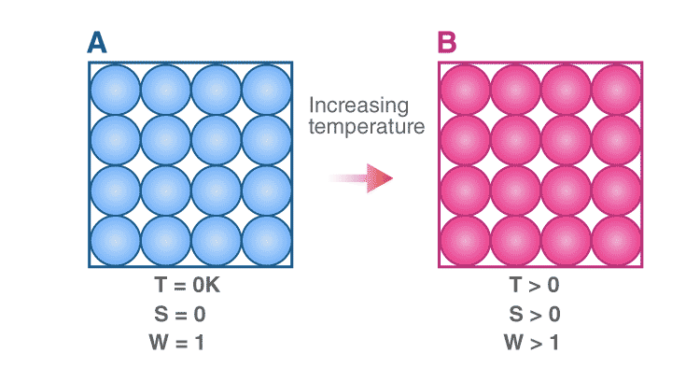 Entropy, denoted by ‘S’, is a measure of the disorder/randomness in a closed system. It is directly related to the number of microstates (a fixed microscopic state that can be occupied by a system) accessible by the system, i.e. the greater the number of microstates the closed system can occupy, the greater its entropy. The microstate in which the energy of the system is at its minimum is called the ground state of the system.