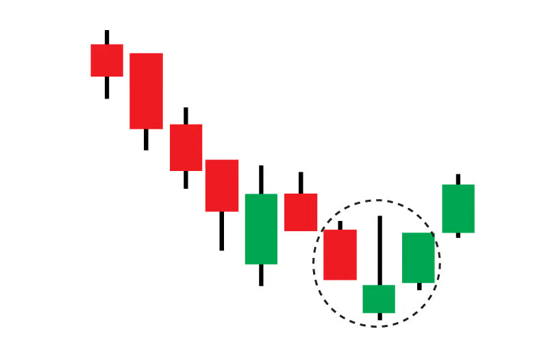 The first candle is a short-bodied red candle. It is short-bodied because there is in-fighting going on among the bulls and bears while the first candle is being formed. There must be a prevailing downtrend for this trend to appear.