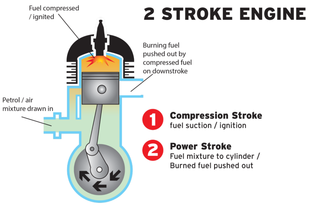 - Two-stroke engines are found in small scales propulsion applications such as motorcycles, Mopeds, and dirt bikes.